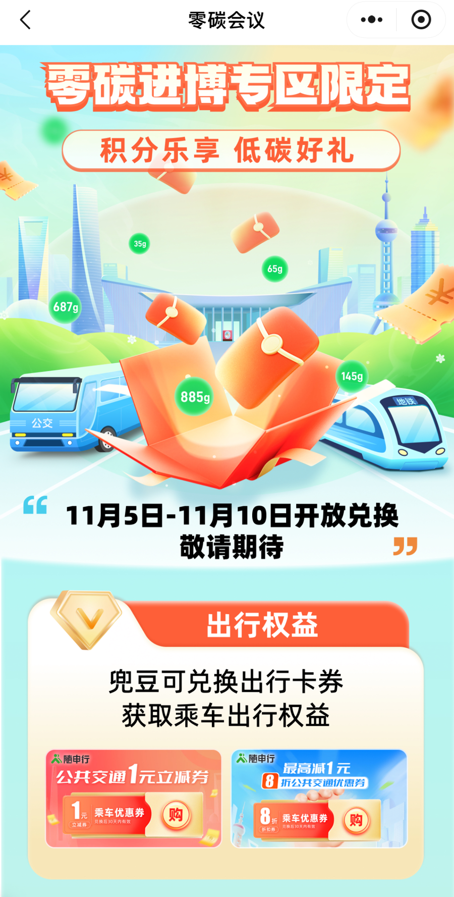 同时,设立“零碳会议”板块,共计发放超万份公共出行优惠券,号召更多观众践行“绿色出行”。用户在完成“随申行”平台“碳普惠”数据授权后,进博会期间可将“绿色出行”减排量兑换成碳积分,在“零碳会议”专区内可兑换公共交通1元立减券或8折乘车优惠券等福利。